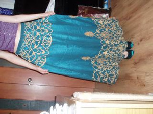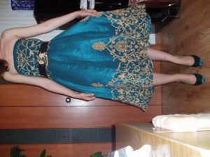 Очень классный покрой, красивая спина, драпировка на груди, два слоя воланов. В общем, супер! Покупалось в переводе на наши деньги примерно около 5 тысяч, отдам 1.800!!! . Для такого платья это даром.