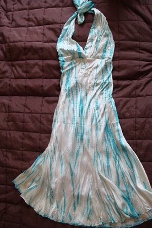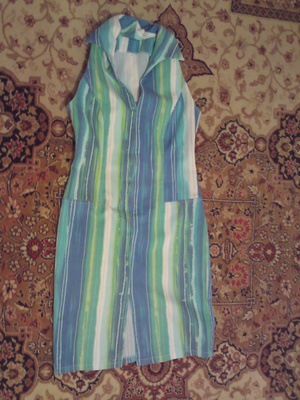 франц. платье jus d`orange, приятная на ощупь прохладная ткань, цвета морской волны на подкладе, на стройную девушку с грудью, р-р 42-44, длина зависит от роста, мне при 166 чуть ниже колена, одевала пару раз.1000р., покупала значительно дороже)