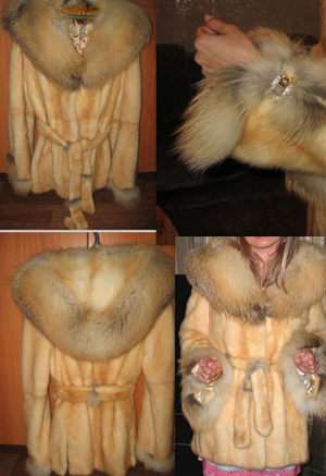 Цвет янтарно-бежевый натуральный не крашеный. размер 44-48 (надо мерить). Цена 31 . Зимой будет дороже.