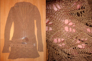 коричневая удлиненная кофта,достаточно крупной вязки.справа показана вязка нижней части вещи