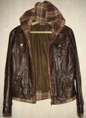 Куртка кожзам с тканевыми вставками и капюшоном. Цвет - коричневый. Размер - 42-44. Одевала пару раз. Причина продажи - я высокая, рукава коротковаты. Цена - 700р.