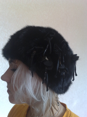 норковый берет,цвет черный бриллиант, сбоку декорирован узором ввиде цветов(кожа).Регулируемый размер.Производство "Меха Сибири" 1500 торг Тел: 8-923-121-20-50