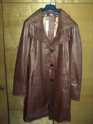 Очень красивый новый кожаный плащ немецкий, размер 48, кожа свиная, не очень мягкая, из-за наката как будто слегка прорезиненная.