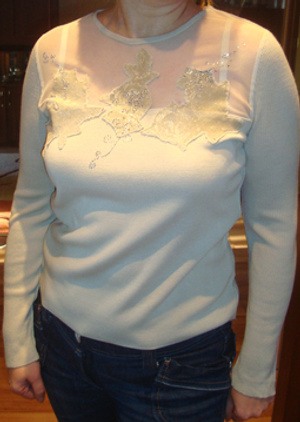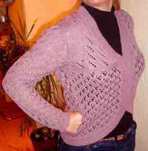 Нарядная кофточка из легкой, но прочной, почти прозрачной ткани, со вставкой на груди, чтоб не просвечивало, глубокое декольте,по декольте пайетки, длинные ассиметричные рукава, внизу у кофты сбоку завязывается интересный узелок. Размер 46-48. Цена 500 руб.