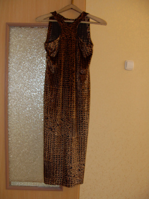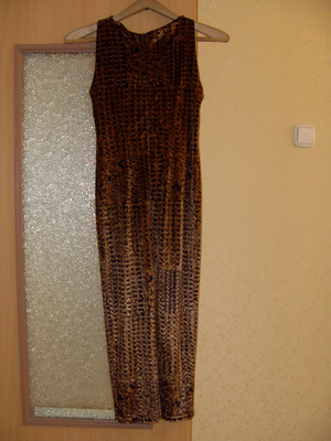 Продам платье вечернее. "Тигрового" цвета, длинное, прямое. Сзади "скрытый" замок на всю спину, снизу разрез. Материал стрейч, поэтому подойдёт под разные фигуры. Размер 42-44. Сшито было на заказ, одевалось 1 раз на Новый год. Цена 700 руб. Примерка в районе ост. Плановая. Тел. 8-952-924-27-49 или пишите в личку.