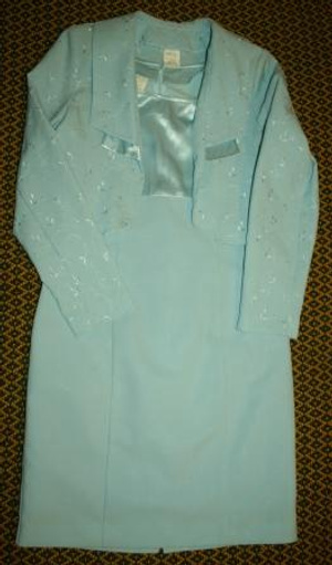 Платье небесно-голубого цвета, прямое, до колен. Верх атласный, к платью есть болеро. 500 руб.Платье из Германии, одето 2 раза. Размер 42-44.
