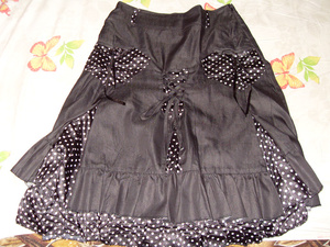3. Юбка тёплая. Чёрная со вставками "горошины". Состояние отл. Спереди 2 кармашка, сбоку замочек. Форма-трапеция. Длина 63 см. Размер 42-44. Цена 1 тыс.