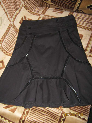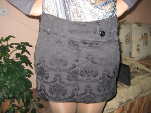 5. Юбка OGGI. Форма - трапеция. Цвет серый металлик. Внизу оборка от подклада - чёрная сеточка. Низ украшен чёрными пайетками. Замочек сбоку. Состояние отл. Длина 63 см. Размер 42-44. Цена 1 тыс.