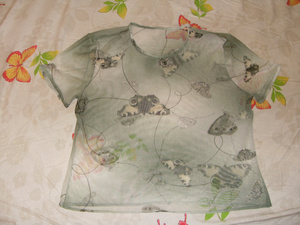 2. Кофточка-сеточка с коротким рукавом. Шилась на заказ. Состояние отл. Цвет зелёный с белым. Рисунок - бабочки. Размер 42-44. Длина 49 см. Цена 500 р.