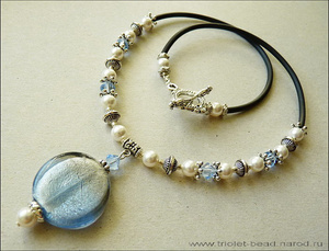 Кулон-лэмпворк с внутренним серебрением, кристаллы Сваровски цвета Aquamarine, жемчуг Сваровски цвета White, каучуковый шнур.