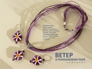 Легкий воздушный комплект "Ветер в ромашковом поле". Художественное стекло ручной работы «лэмпворк» (Чехия), вощеный шнур разных оттенков сиреневого цвета, органза, кристаллы Сваровски, фурнитура под черненое серебро. Размер ромашки - 2 см. Колье длиной около 43 см ("под шею") -400 руб. Серьги на серебре- 520 руб.