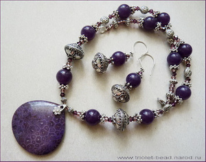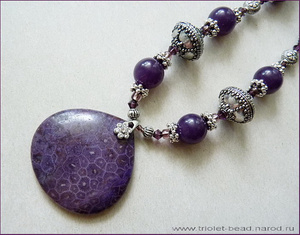 Кулон из окаменевших кораллов, халцедон, кристаллы Сваровски цвета Amethyst. Длина до кулона 45 см, высота кулона 4 см. Швензы серег - серебро Бали, длина от швензы 3,5 см (металлические бусины полые, т.ч. серьги не экстремально тяжелые).