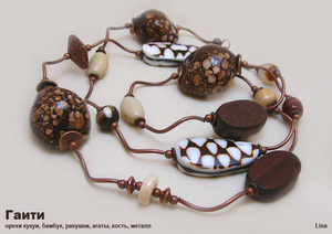 Орехи кукуи, ракушки, бамбук, агаты, кость, металл.