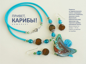 Комплект "Привет, Карибы!": яркое жизнерадостное летнее украшение с подвеской-«лэмпворк», натуральными агатами, кристаллами Сваровски и граненым стеклом на голубом бархатистом шнуре. Серьги на серебре. Длина по шнуру 47 см. 1100 руб.