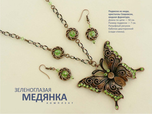 Комплект "Зеленоглазая медянка": подвеска из меди, кристаллы Сваровски, медная фурнитура. Длина по цепи — 50 см. Размер подвески — 7 см. Рельефный рисунок бабочки двусторонний (сзади спинка). Кулон 1000 руб., серьги 320 руб.
