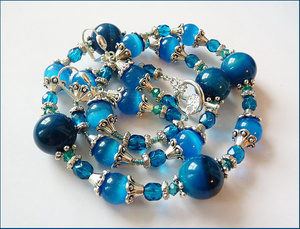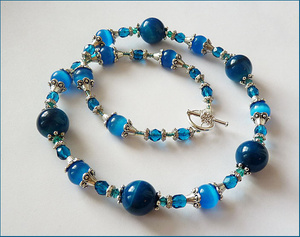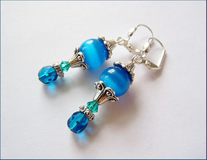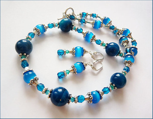 Пять крупных агатовых бусин, стеклянный кошачий глаз, чешское стекло, кристаллы Сваровски цветов Indicolite и Blue Zircon. Длина бус 50 см, серьги на посеребренных швензах.