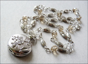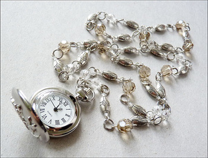 Кварцевые часики (диаметр 3 см), прозрачное и дымчатое граненое стекло, металлические бусины. Длина 80 см.