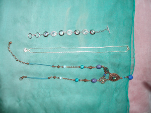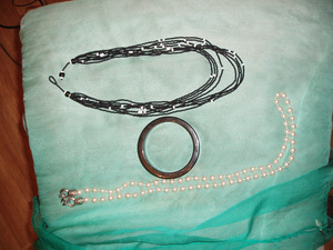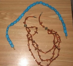 Два колье - никто не носил, одно под золото с камнем, массивное и очень эффектное, второе - под этно, под серебро с голубыми камнями, очень оригинальное, покупалось давно очень задорого. Каждое по 200 рублей