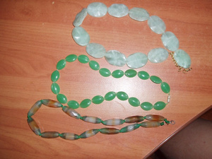 Бусы из натур. камней, все не ношены. Снизу вверх: агат, 250 рублей, хризопраз или хризолит, что-то такое. очень красивые цвета яблока, мне, к сожалению, не идет цвет, покупала почти за тысячц, 200 рублей. Стильные тоже из как-то камня, 100 рублей.