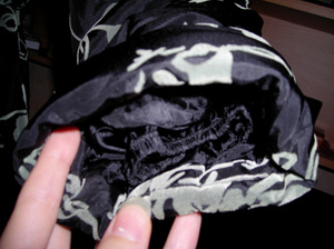Цвет чёрный, рисунок серый, цветы как-бы бархатные. Цена 2000 рублей.