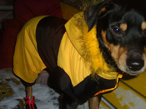 Собачка той-терьер (только переросток) обувь не скидывает, так гуляет и по сугробам носится. Зато ему тепло