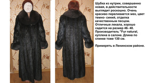 размер 46-48 (с шикарным песцовым воротником)- мех просто прелесть, очень красиво блестит! Расцветка: благородный синий отлив. Цена 9 000 рублей . На фото- модель мЕньшей, нежели требует шубка ростовки, поэтому рукава как бы длинноватые. Шубка отличного покроя и смотрится очень богато.