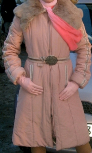 1) Пальто утепленное на синтепоне на молнии. Очень теплое, до -15 отлично. Рост до 180 - манжеты закатываются. На рост 170 колени закрывает полностью (на фото). Размер 44, возможно на 46. Цвет пудры, в реале глуховатый, ткань с небольшим блеском.