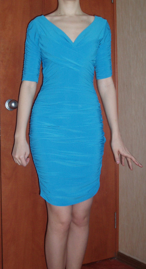Потрясающее платье-"бандаж" в стиле знаменитого Herve Leger ярко-голубого цвета английской фирмы Black Berry, на наш 42-44 (грудь 2-3, бедра до 95). На груди драпировки, присборенные рукава, сборки на самом платье, не знаю, как описать - см. фото. Крайне выгодно подчеркивает фигуру. В таком платье не останетесь незамеченной! Надевала 3 раза, состояние соответствующее.