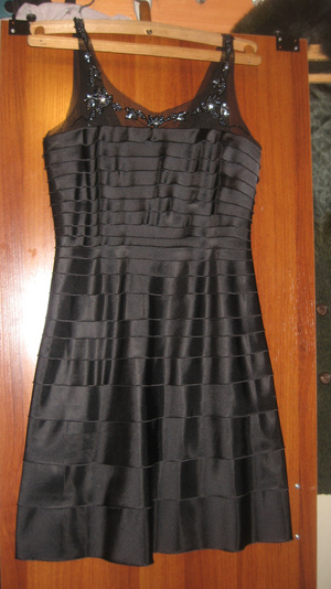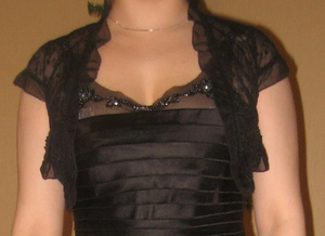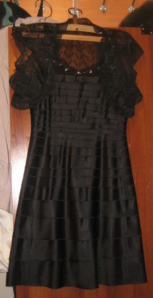 платье черное атласное с прозрачным подкладом хорошо сидит на фигуре и стройнит размер 44-46, сзади молния, с этим болеро 2500 руб