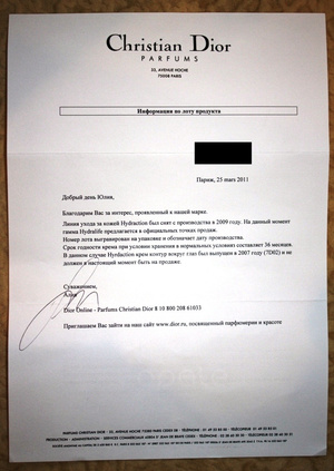Пришло мое письмецо из Диор. Аж из Франции шло. Правда без печати, но на фирменном бланке, надпись Christian Dior не просто напечатана, а как-бы выпуклая такая. Плюс конверт сохранила в подтверждение с почтовыми отметками. Сходила в ОЗПП, написали претензию, приложу копию письма и понесу в ЛЭ. Посмотрим что будет. Также затеяла информационную войну, попросила блоггершу одну очень известную разместить мою историю.