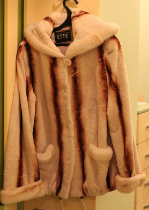 Шуба норка стриженная. Размер на 44-46. Цвет молочный с темными полосками. Длина рукава 66 см, по спинке - 73 см. Внизу на кулиске. Цена 9000 р. Возможен торг.