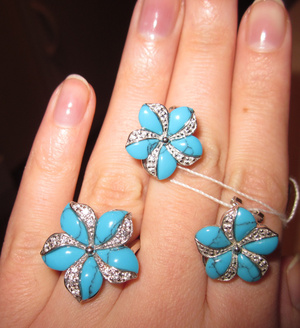 1. Серьги и кольцо с бирюзой и фианитами. Кольцо р-р 17.5. Цена кольца- 1033р. Серьги-1460р.