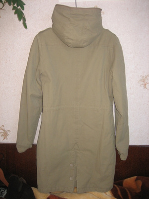 Пуховик Sisley. Размер S (наш 42-44). Цвет оливковый (фото немного искажает). Длина рукава 63 см, по спинке - 92 см. В рукаве есть дополнительная резинка. Капюшон отстегивается. Цена 1300 р.