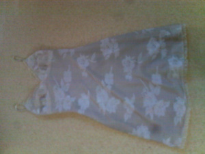 1. бежевое с подкладом на тонких лямках. шила на заказ на свадьбу - собственно на нее только и одевала. стоимость 900 руб. с торгом. верх ткань с рисунком - цветы, по лифу и и подолу - небольшая воздушная рюшка