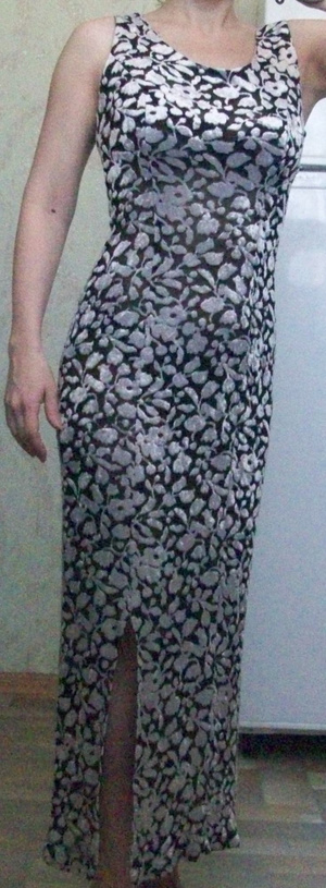Серо-серебристое длинное платье с разрезом. Сзади - замок. Ткань что-то типа пан-бархата. Тянется. Местами просвечивает, если надевать без подъюбника с контрастным по цвету бельем. Но вечерним я бы его не назвала. В пир и в мир. Длина подшита на невысокий рост. Размер 42-44. 500 рублей.