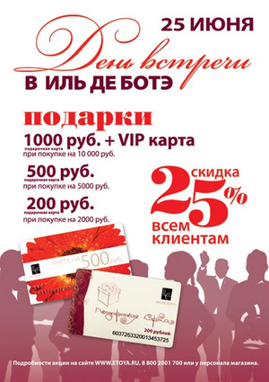 смс: 25-го в ильдэботэ день встречи. 25% скидка, подарки. ну и, соответствующие карты в подарок.