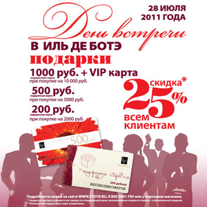 Только 14 июля 2011 года, совершив покупку на сумму от 2 000 рублей (после скидки) в любом из магазинов сети парфюмерии и косметики ИЛЬ ДЕ БОТЭ, вы получаете подарочную карту от ИЛЬ ДЕ БОТЭ номиналом 500 рублей.