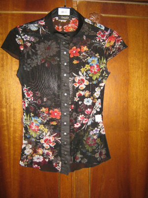 Прозрачная. Застегивается под горло. Смотрится строго и волнующе, особенно с красивым бельем))