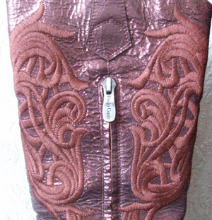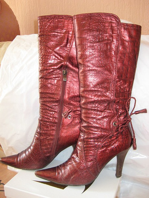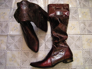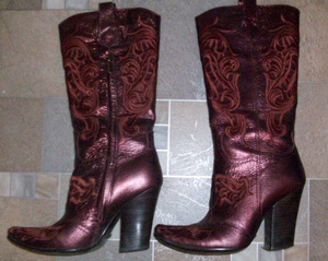 Очень красивые демисезонные сапожки 35 - 35,5 размера. На широкую взъемистую ногу. Натуральная кожа с лазерной обработкой, расшитая орнаментами в русском стиле. Цвет обозначен как бордо, но сапоги мерцают и переливаются. При дневном свете, они бордовые, при искусственном - лиловые. Устойчивый каблук 10 см. Все в целом смотрится - глаз не оторвать. Ношены один или два раза. Для меня высоковат каблук. 1000 рублей.