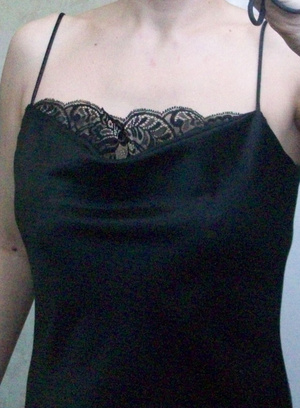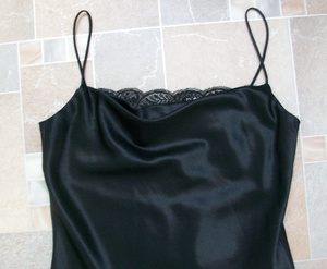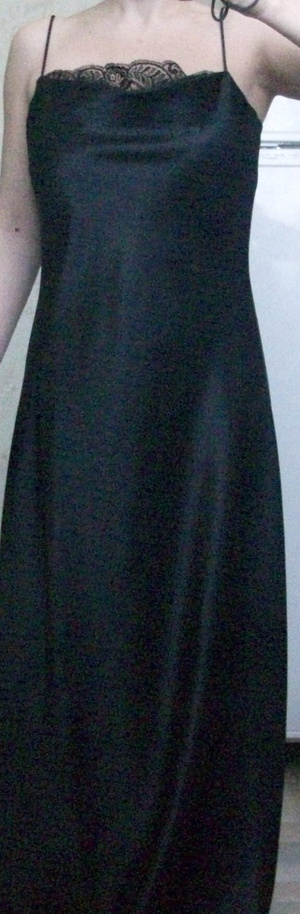 Элегантное вечернее платье в бельевом стиле из черного плотного креп-жоржета с атласным блеском. Немецкое. Практически не мнется. Тонкие бретельки, отделка кружевом по линии груди, легкий клеш от талии. На рост 165-170 будет в пол. Маркировка 38. Размер 44-46. Одето раз или два. Состояние нового. 900 рублей.