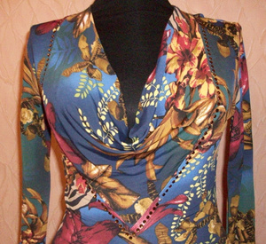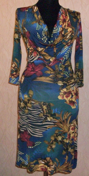 Платьице, красивое. Английская фирма IceI. Яркий цветочный принт. Украсит темноволосую девушку. Подчеркивает фигуру, особенно-грудь. Трикотаж. Приятная на ощупь ткань. Стройнит! Визуально минус 5 кг! Хорошо смотрится на фото и видео. Воротник-шалочка, Рукав три четверти. Деликатная отделка стразами. Размер европейский -36, российский - 42-44. Лучше на небольшой рост. Несколько раз одето. Состояние отличное. 700 рублей