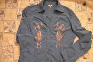 Черная батистовая туничка. 42-44. "Фасад" - весь в вышивке. Голубые камушки и нити. Спинка - глухая черная. Отлично смотрится с джинсами. По бокам - разрезы. 500 рублей.