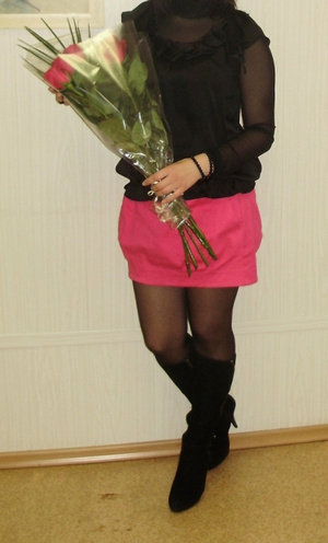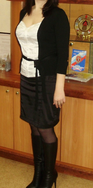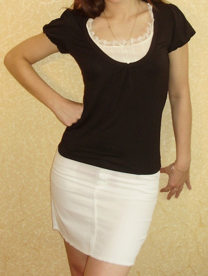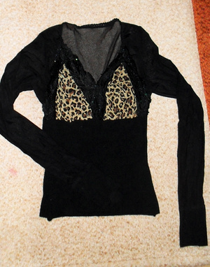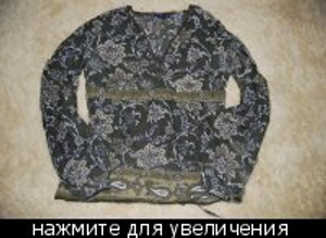 1. Блузка черная с рюшками. Фото не передает всей красоты, особенно спинку. Сзади по спинке не сшито по шву, вверху застегивается на пуговичку (спинка открытая, очень сексуально). Но я посередине застегивала на булавочку, и разреза видно не было, можно и в офис надеть. Хорошо смотрится как одна, так и с черной сеткой-водолазкой. Низ на резинке. Состояние отличное. Размер 44-46. Цена 800р.