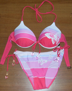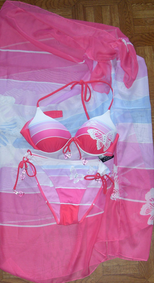 купальник розовый с парэо, пушап , для размеров 44-46, объем плавок регулируется боковыми завязками, в комплекте еще есть зажим для носа и пробочки для ушей их мягкого пластика( для тех кто любит нырять), цена 700