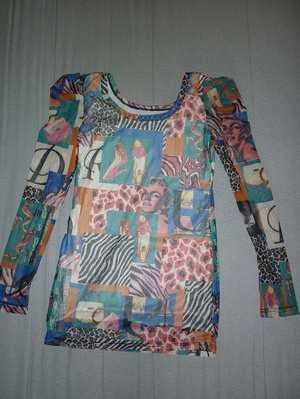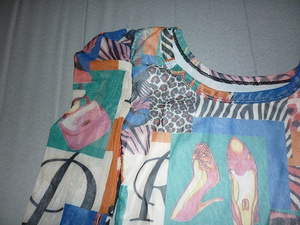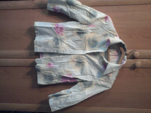3. рубашечка, подойдет наверно, даже на 44 размер. светло зелененькая с цветными разводами. интересный материал - почти не разглаживается. рукав 3/4 - 200 руб.