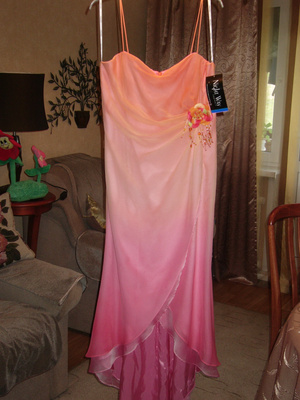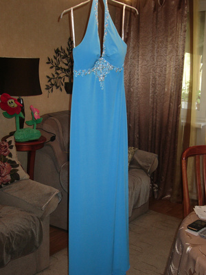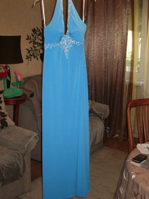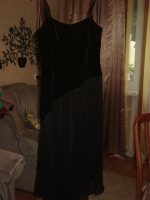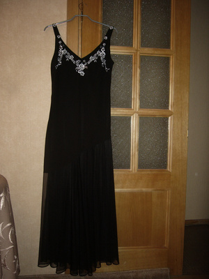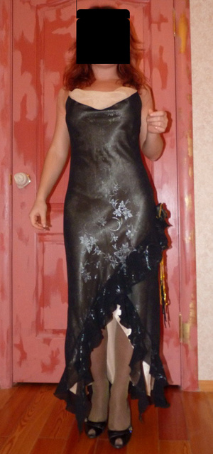 2. вечернее/выпускное платье. Двуслойное. материал не помню. Низ золотистый, верх черный немного прозрачный с серебристыми цветами. Сбоку принт в виде золотого цветка из пайеток. Ворот можно заправить внутрь или сделать качелькой. Р.42-44 = 700 руб.
