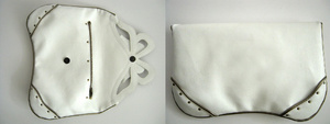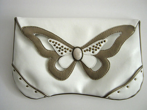 1- Искожа белая, отделка под бронзу. Размер 27х16 см., плоская, под клапаном молния (18 см.) Внутри одно отделение. Бабочка со сквозными прорезями. 900 р.