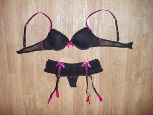 Классный комплект нижнего белья какой-то американской фирмы, если мне память не изменяет, Rene Rofe (покупался на американском сайте) на 70-75 А и плавки на бедра где-то 88-92. Надевала один раз бюст - не подошел он мне по форме. Внутри хороший пуш-ап. Трусики очень оригинальные - к ним сразу пришиты пажи и пояс, то есть можно носить с чулками. Вообще комплект очень игривый и сексуальный. Отдам за 500 без примерки, покупала намного дороже.
