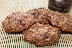 Я делала в пропорциях:50 г овсянки,50 г ряженки(кефира),1 белок,10 г изюма,пол ложечки натурального какао,корица,ванилин.Смешать все ингредиенты,выложить на фольгу или пергамент.Выпекать в течении 20-25 мин при небольшой t.(с)Как авторское право указать не знаю,так что просто напишу. Автор:Ольга Васильева.Фото тоже ее,но у меня не менее симпотичные,просто на работе фотика нет,а дома я как-т и не подумала это сделать.