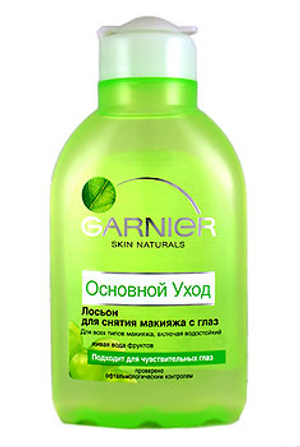 2. Лосьон Garnier для снятия косметики с глаз. Удаляет в т.ч. водостойкую косметику. Подходит для чувствительных глаз. Не надо смывать.